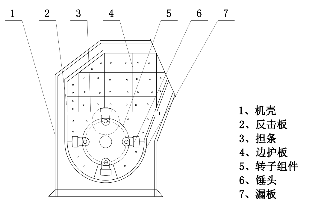 工作原理:電機經(jīng)皮帶輪傳動(dòng)帶動(dòng)轉子旋轉,使裝在轉子盤(pán)上的錘頭做高速圓周運動(dòng),當物料進(jìn)入破碎腔后,大塊物料堆放在機內中部的擔條上,被高速旋轉的錘頭擊碎,粒度不合格的大物料和新物料被打向反擊板和漏板進(jìn)行再次破碎直至合格,合格的物料經(jīng)漏板排出。